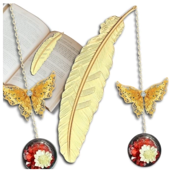 Kovová záložka, zlaté peříčko s přívěskem motýla